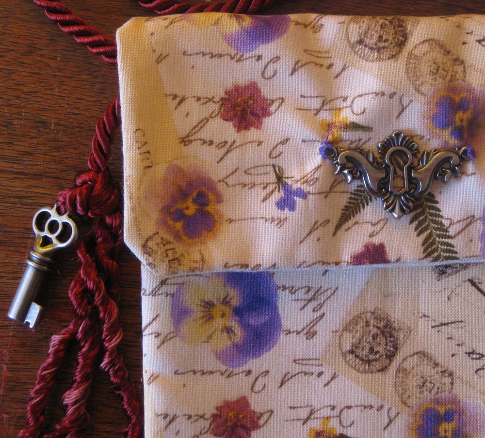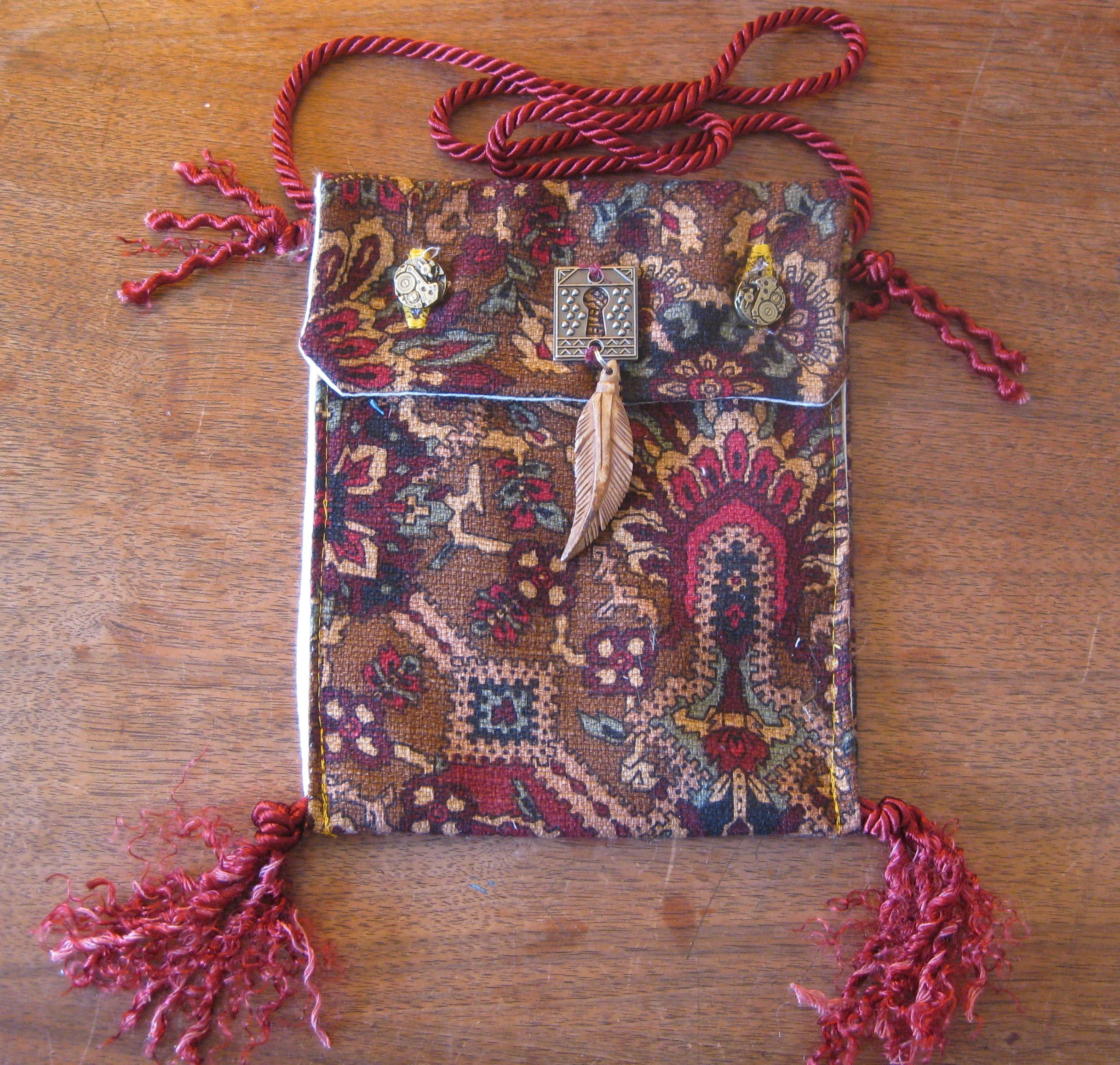 (1) A small, lined pouch with postmark fabric and metal adornments